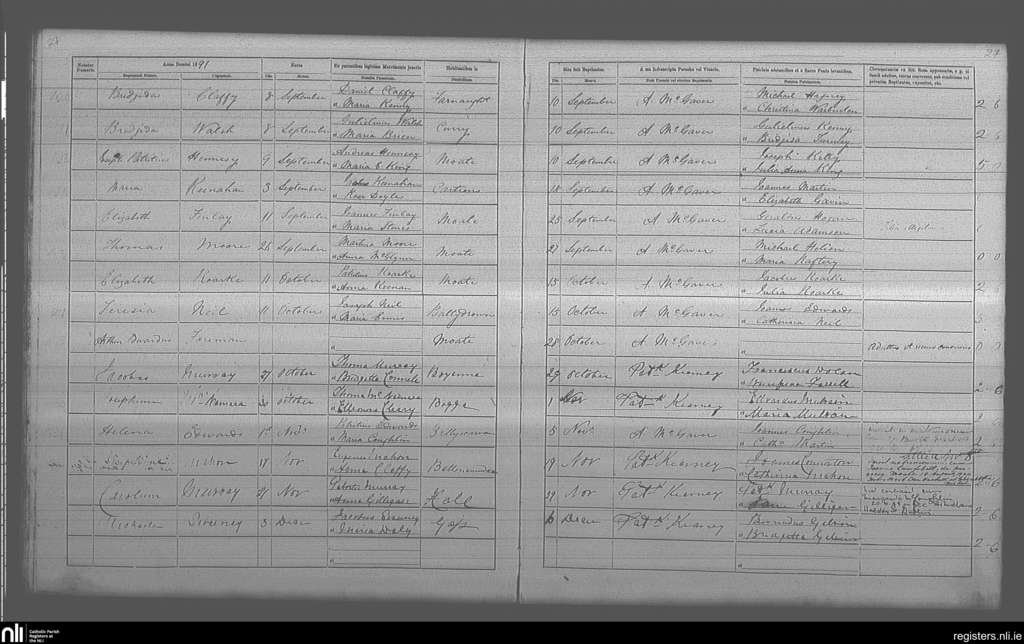 Moate; County of Offaly, Westmeath; Diocese of Ardagh. Baptisms, Sep. 1891 to Dec. 1891