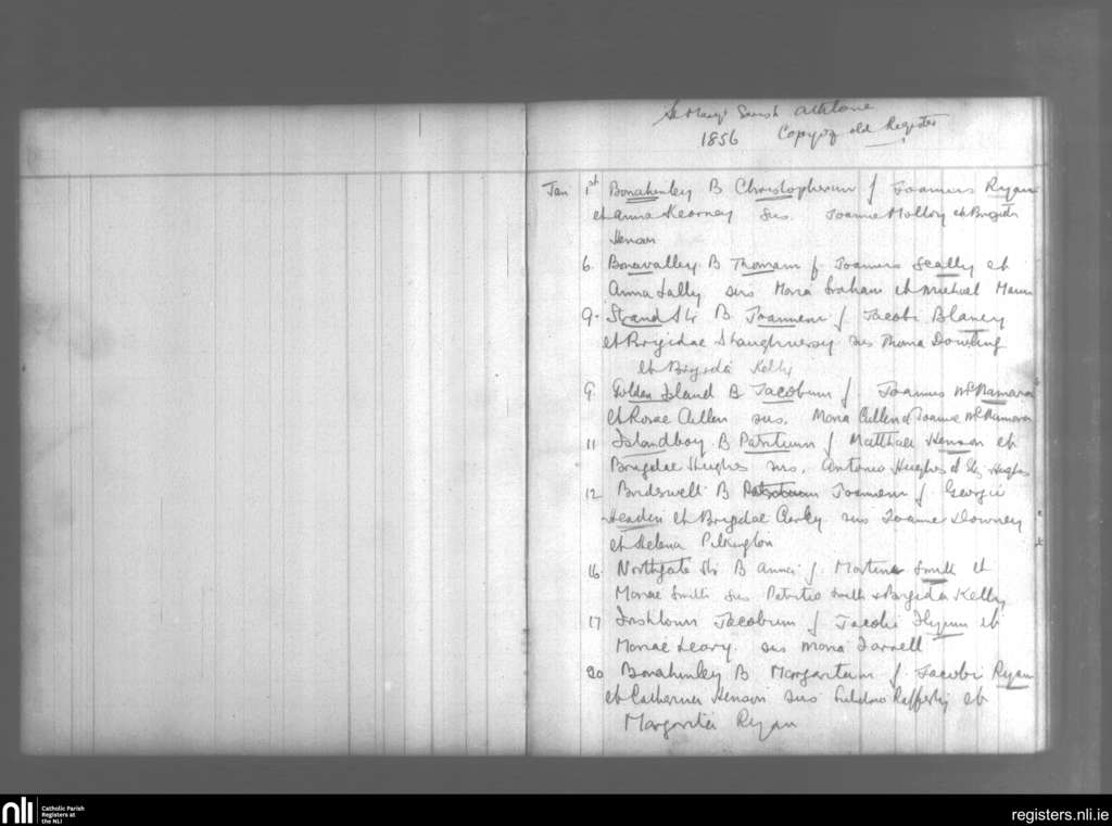 St. Mary's, Athlone; County of Westmeath; Diocese of Ardagh. Baptisms, Jan. 1856