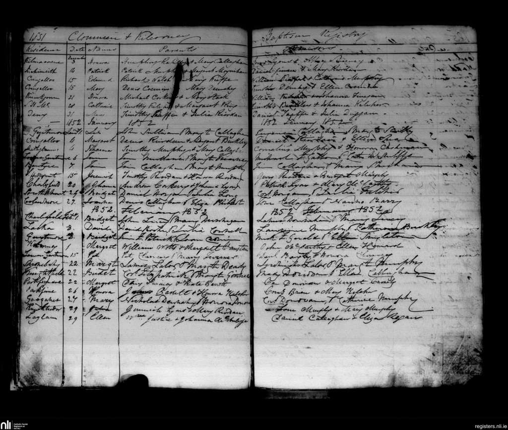 Banteer; County of Cork; Diocese of Cloyne. Baptisms, Dec. 1851 to Feb. 1852