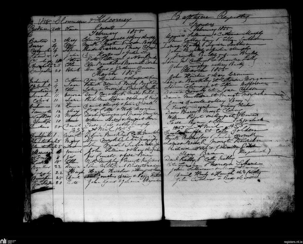 Banteer; County of Cork; Diocese of Cloyne. Baptisms, Feb. 1855 to Apr. 1855