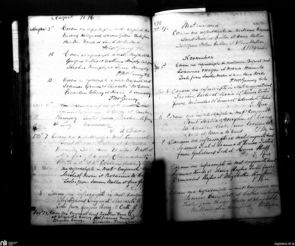 Armagh; County of Armagh; Archdiocese of Armagh. Marriages, Aug. 1876 to Nov. 1876