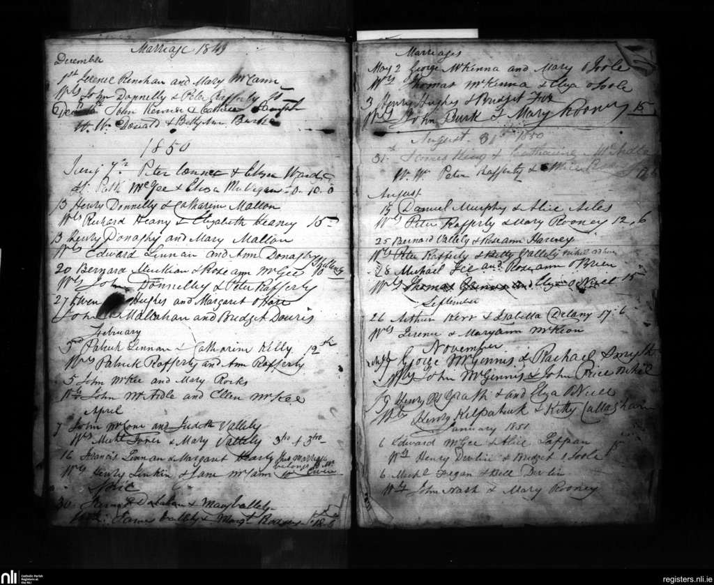 Ballymacnab; County of Armagh; Archdiocese of Armagh. Marriages, Dec. 1849 to Jan. 1851