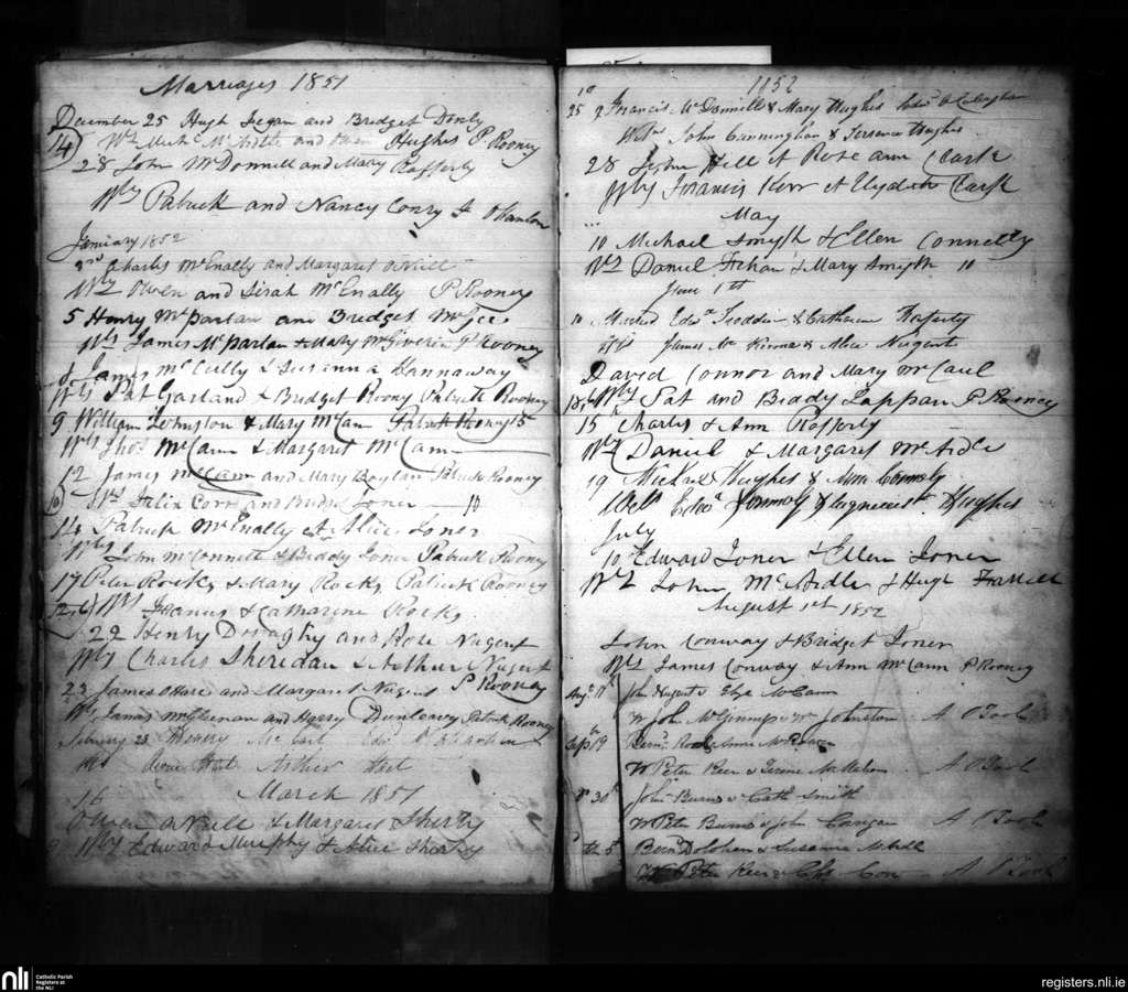 Ballymacnab; County of Armagh; Archdiocese of Armagh. Marriages, Dec. 1851 to Sep. 1852