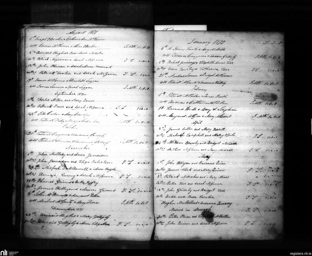 Ballymacnab; County of Armagh; Archdiocese of Armagh. Marriages, Aug. 1871 to May 1872