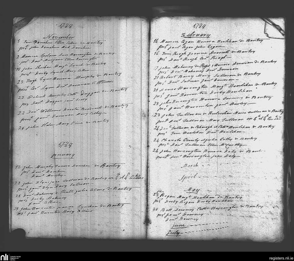 Bantry; County of Cork; Diocese of Cork and Ross. Marriages, Nov. 1788 to July 1789