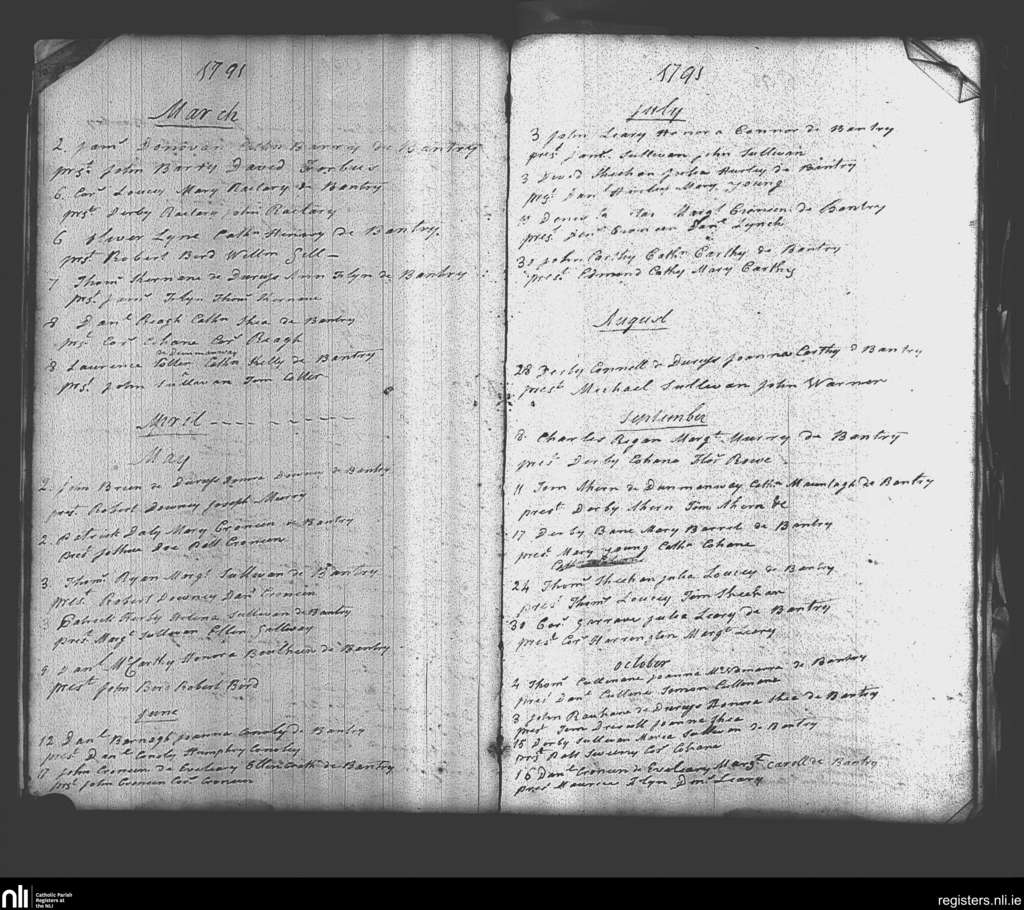 Bantry; County of Cork; Diocese of Cork and Ross. Marriages, Mar. 1791 to Oct. 1791