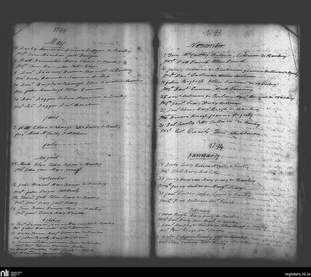 Bantry; County of Cork; Diocese of Cork and Ross. Marriages, May 1793 to Feb. 1794