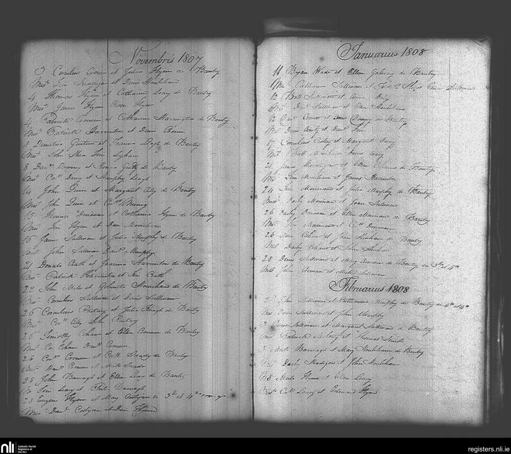 Bantry; County of Cork; Diocese of Cork and Ross. Marriages, Nov. 1807 to Feb. 1808
