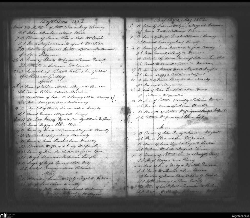 Ballymore and Mullabrack; County of Armagh; Archdiocese of Armagh. Baptisms, Mar. 1852 to May 1852