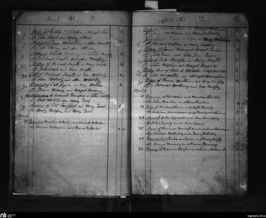 Killeavy Lower; County of Armagh; Archdiocese of Armagh. Baptisms, Mar. 1861 to Apr. 1861