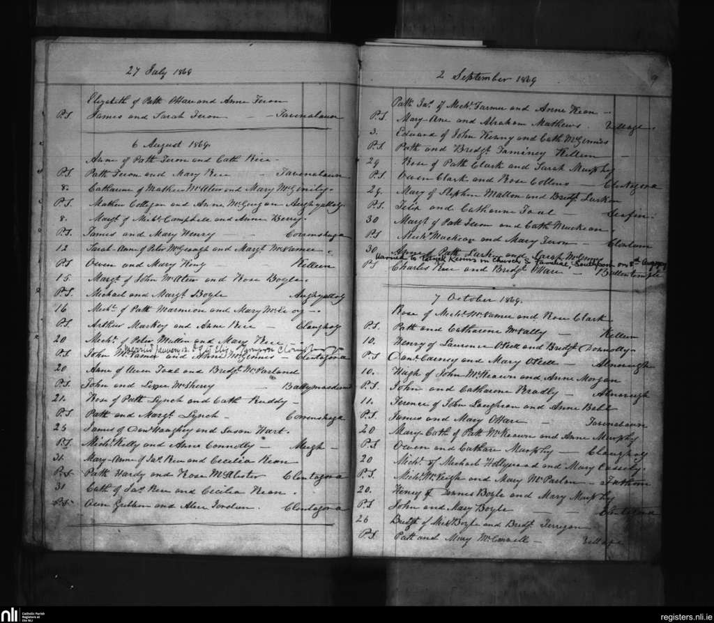 Killeavy Upper; County of Armagh; Archdiocese of Armagh. Baptisms, July 1869 to Oct. 1869