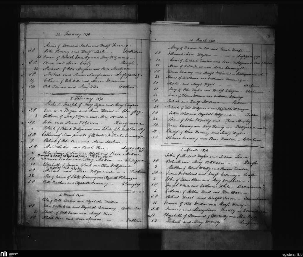 Killeavy Upper; County of Armagh; Archdiocese of Armagh. Baptisms, Jan. 1870 to Apr. 1870