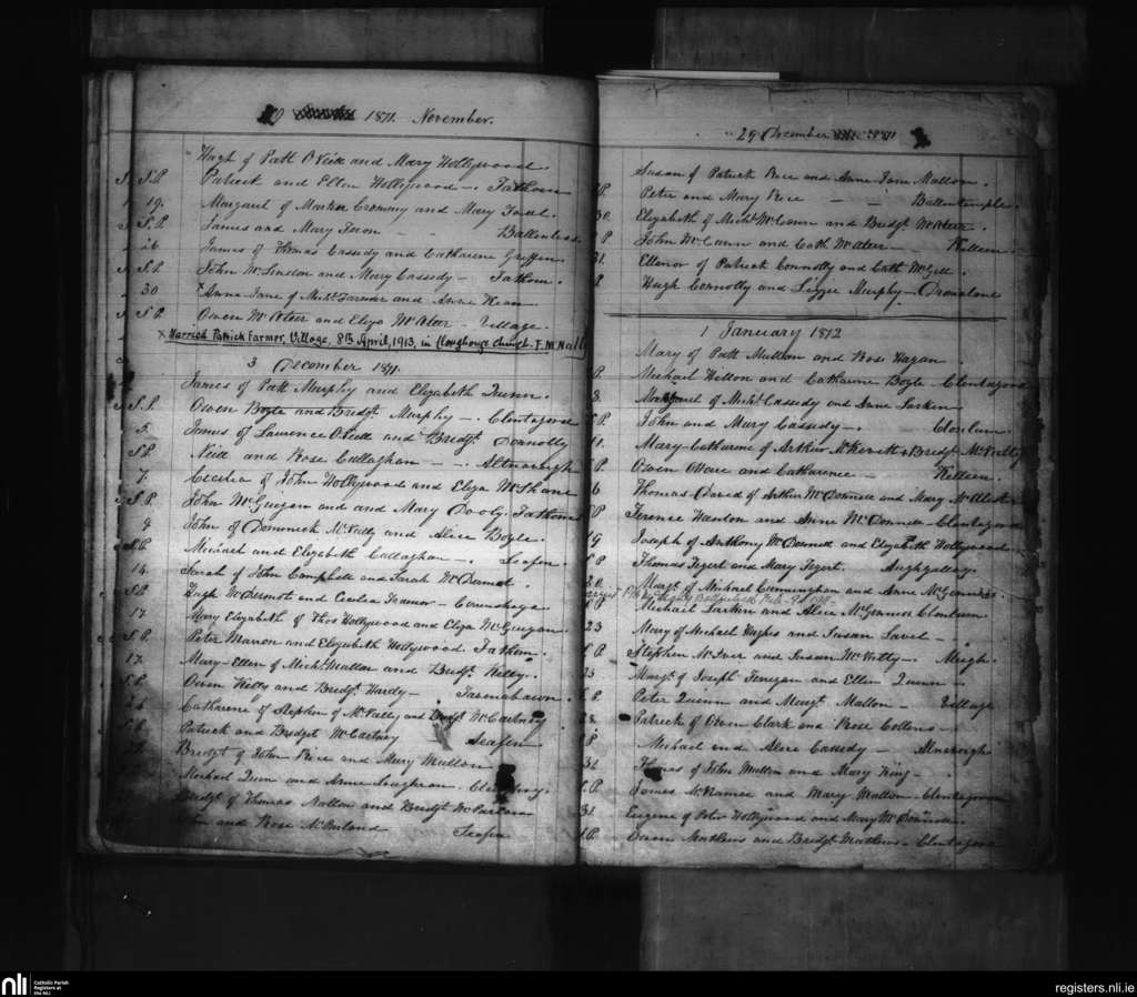 Killeavy Upper; County of Armagh; Archdiocese of Armagh. Baptisms, Nov. 1871 to Jan. 1872