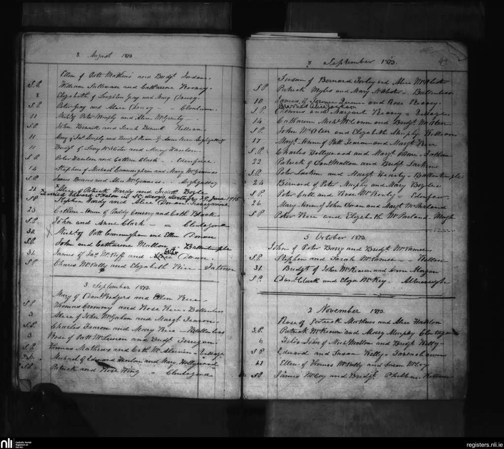 Killeavy Upper; County of Armagh; Archdiocese of Armagh. Baptisms, Aug. 1873 to Nov. 1873