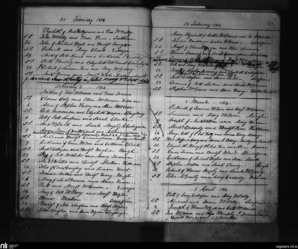Killeavy Upper; County of Armagh; Archdiocese of Armagh. Baptisms, Jan. 1874 to Apr. 1874