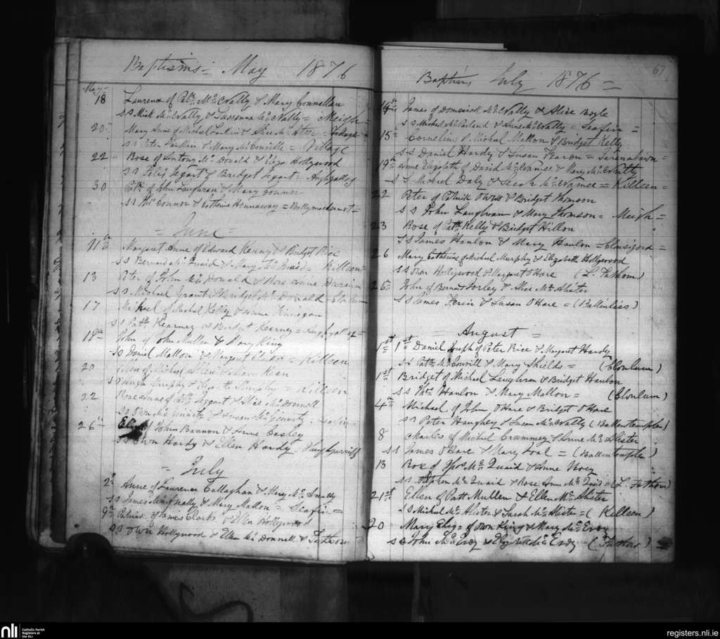 Killeavy Upper; County of Armagh; Archdiocese of Armagh. Baptisms, May 1876 to Aug. 1876