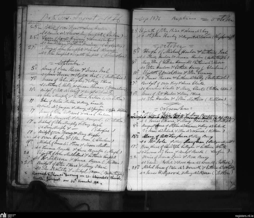 Killeavy Upper; County of Armagh; Archdiocese of Armagh. Baptisms, Aug. 1876 to Nov. 1876