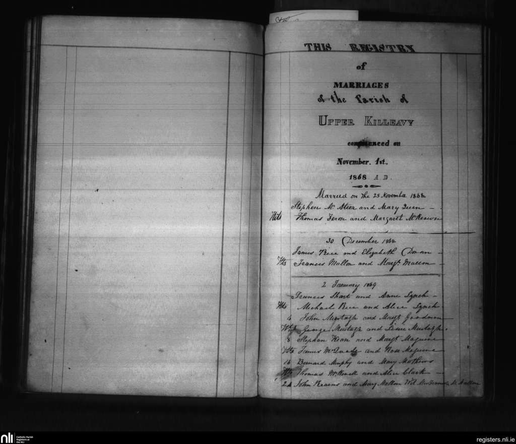 Killeavy Upper; County of Armagh; Archdiocese of Armagh. Marriages, Nov. 1868 to Jan. 1869