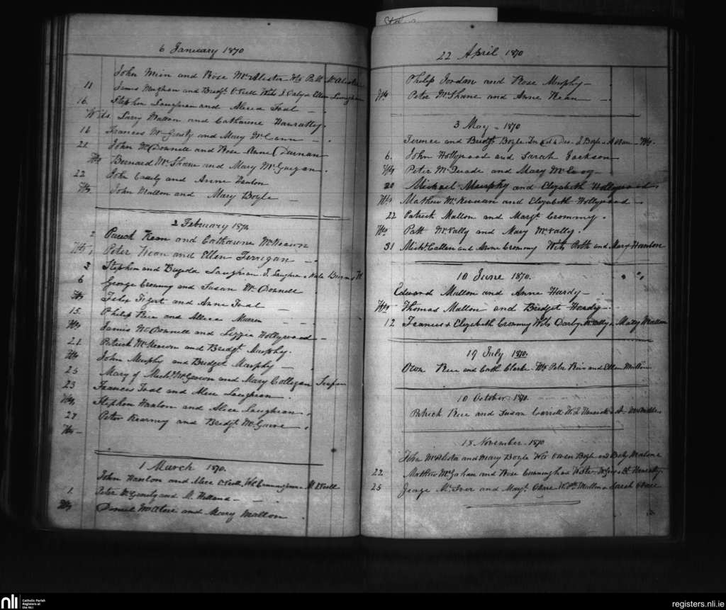 Killeavy Upper; County of Armagh; Archdiocese of Armagh. Marriages, Jan. 1870 to Nov. 1870