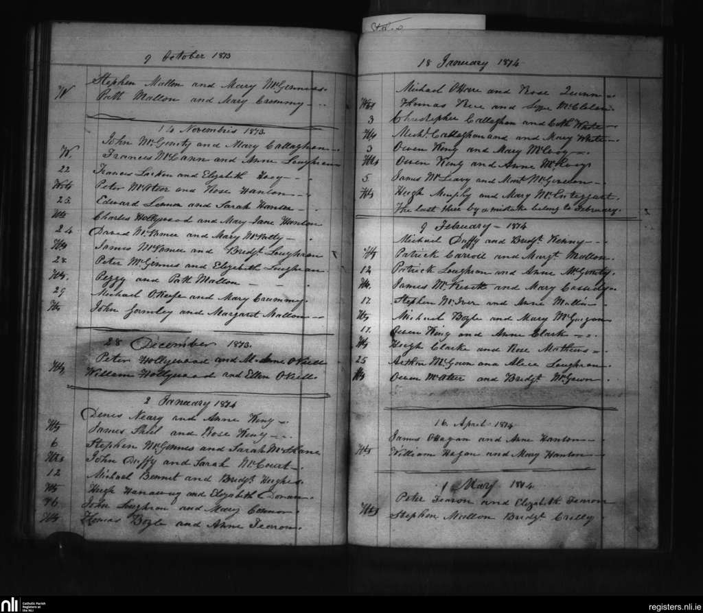 Killeavy Upper; County of Armagh; Archdiocese of Armagh. Marriages, Oct. 1873 to May 1874