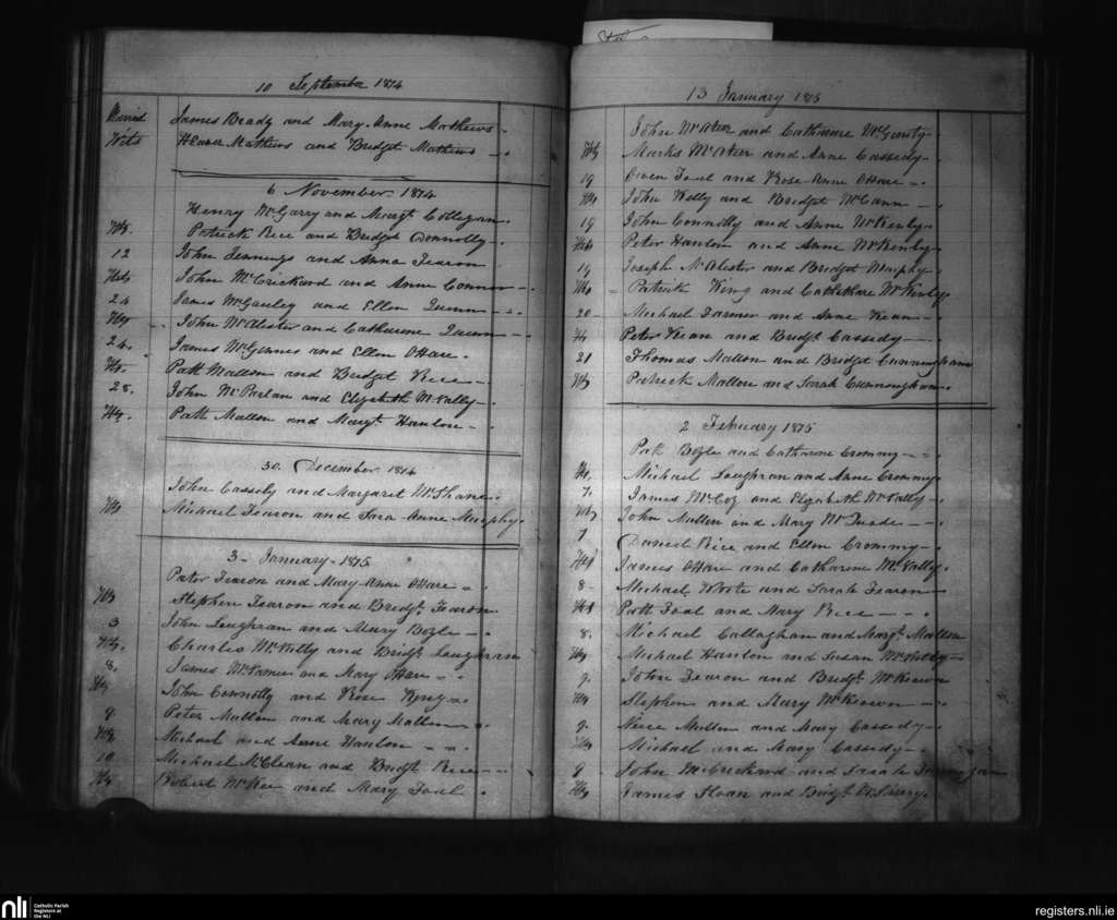 Killeavy Upper; County of Armagh; Archdiocese of Armagh. Marriages, Sep. 1874 to Feb. 1875