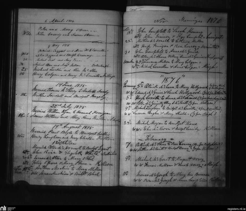 Killeavy Upper; County of Armagh; Archdiocese of Armagh. Marriages, Apr. 1875 to Feb. 1876