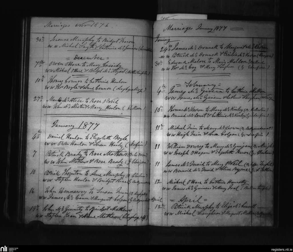 Killeavy Upper; County of Armagh; Archdiocese of Armagh. Marriages, Nov. 1876 to Apr. 1877