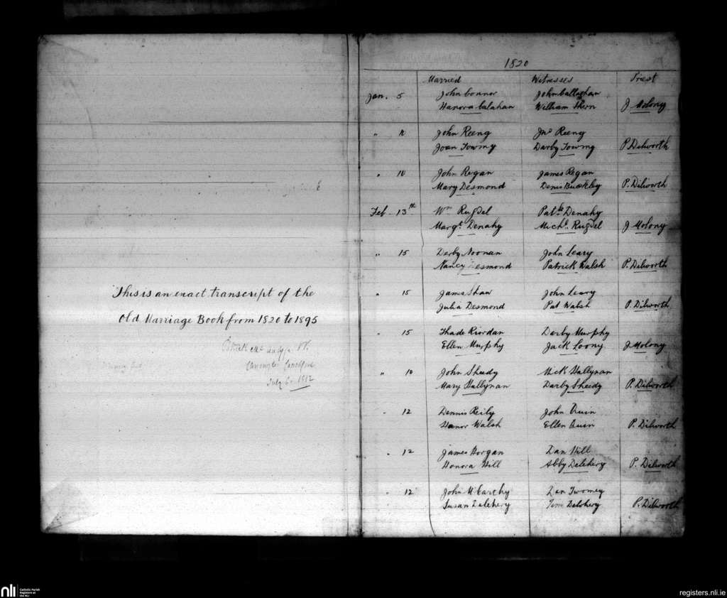 Aghabulloge; County of Cork; Diocese of Cloyne. Marriages, Jan. 1820 to Feb. 1820