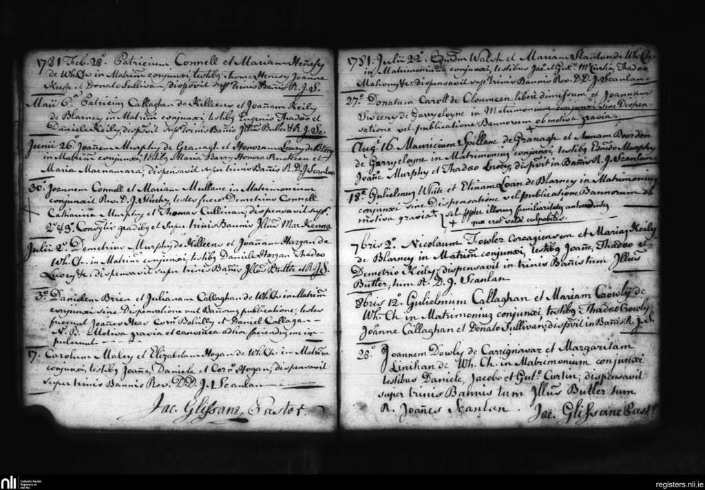 Blarney; County of Cork; Diocese of Cloyne. Marriages, Feb. 1781 to Oct. 1781