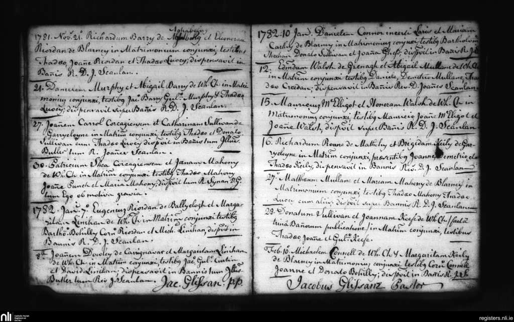 Blarney; County of Cork; Diocese of Cloyne. Marriages, Nov. 1781 to Feb. 1782