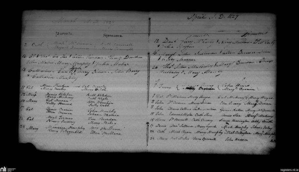 Blarney; County of Cork; Diocese of Cloyne. Baptisms, Mar. 1827 to Apr. 1827