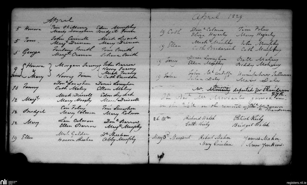 Blarney; County of Cork; Diocese of Cloyne. Baptisms, Apr. 1829 to May 1829