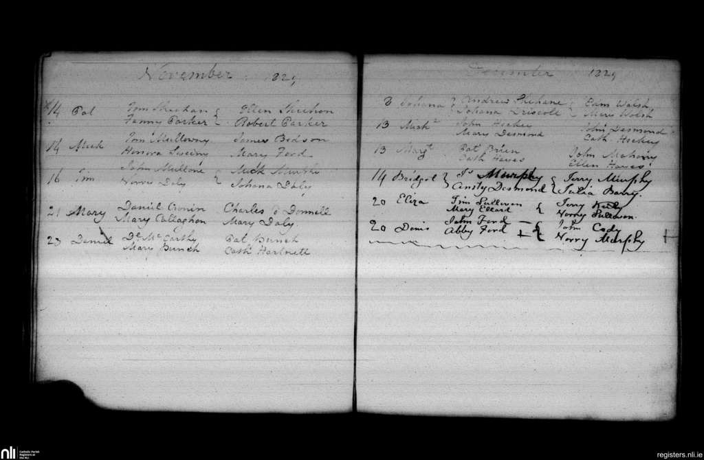Blarney; County of Cork; Diocese of Cloyne. Baptisms, Nov. 1829 to Dec. 1829