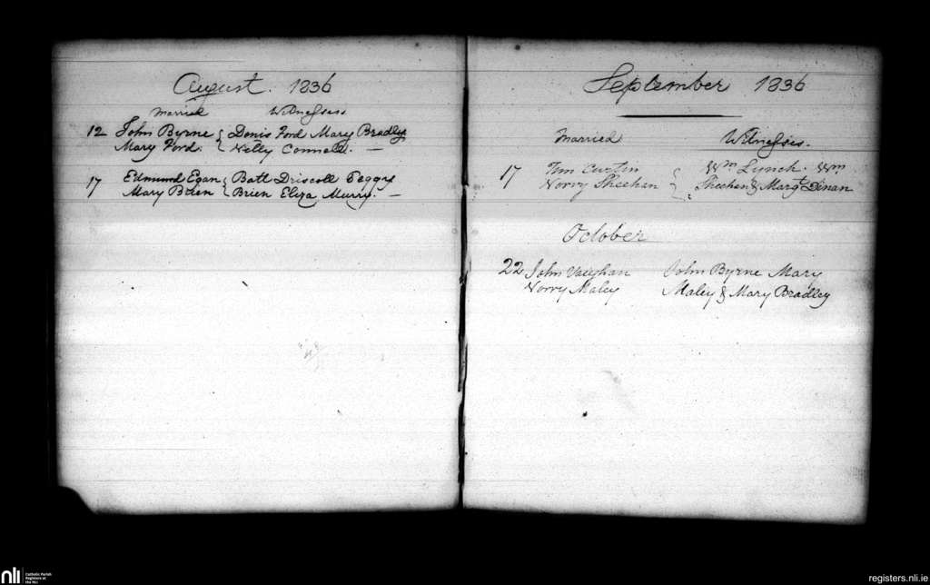 Blarney; County of Cork; Diocese of Cloyne. Marriages, Aug. 1836 to Oct. 1836