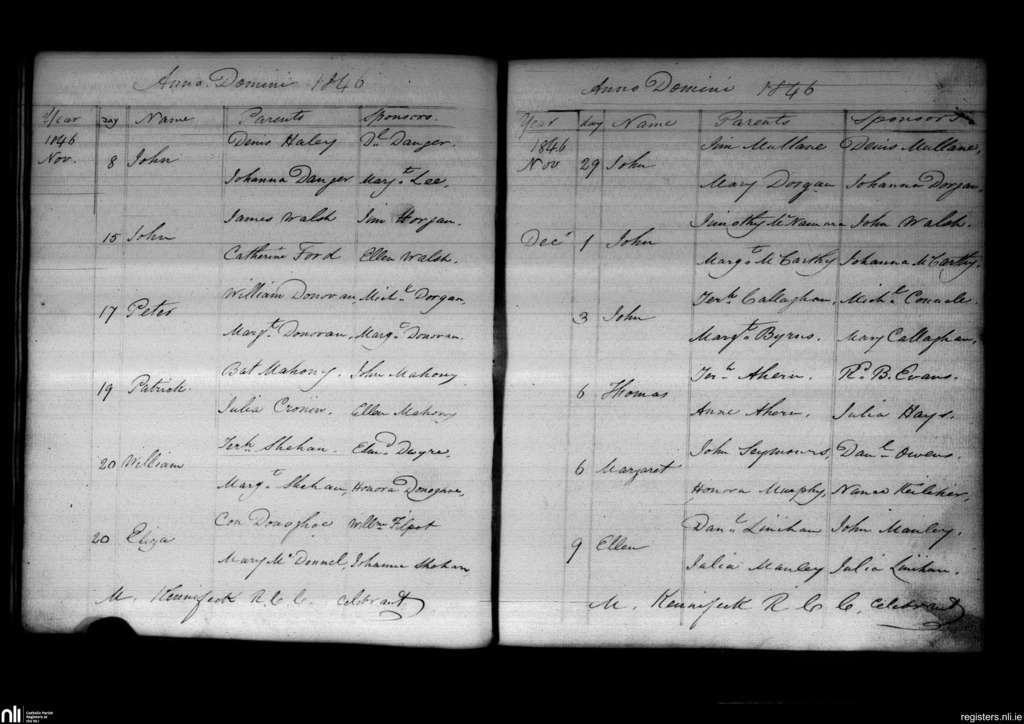 Blarney; County of Cork; Diocese of Cloyne. Baptisms, Nov. 1846 to Dec. 1846