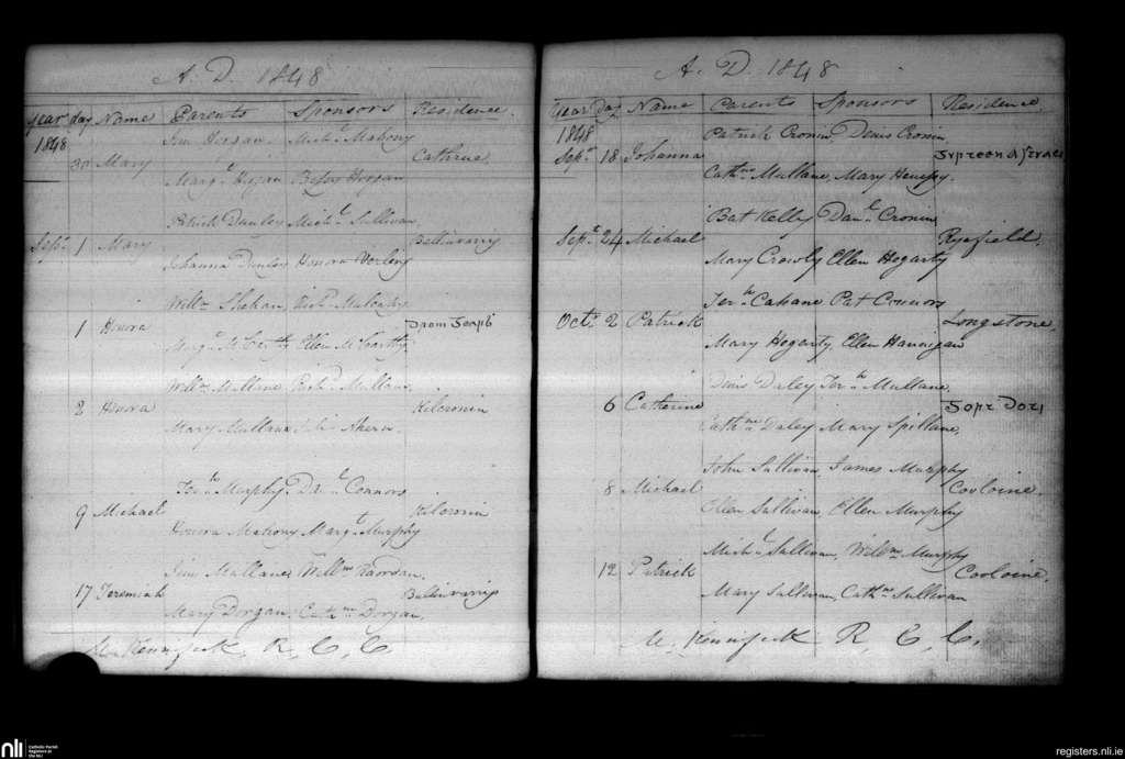 Blarney; County of Cork; Diocese of Cloyne. Baptisms, Aug. 1848 to Oct. 1848
