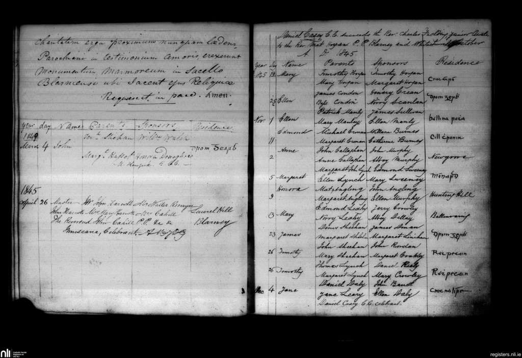 Blarney; County of Cork; Diocese of Cloyne. Baptisms, Apr. 1845 to Mar. 1849