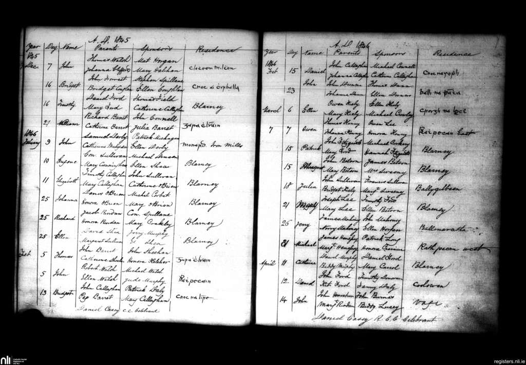 Blarney; County of Cork; Diocese of Cloyne. Baptisms, Dec. 1845 to Apr. 1846