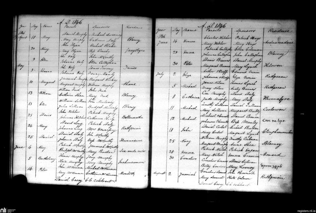 Blarney; County of Cork; Diocese of Cloyne. Baptisms, Apr. 1846 to Aug. 1846