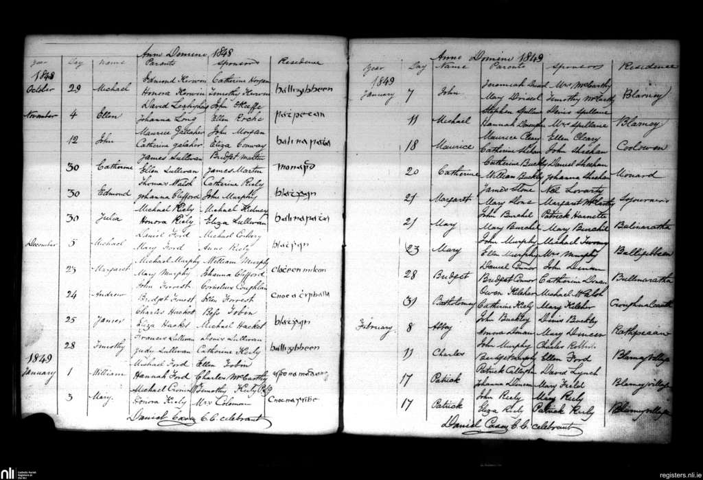 Blarney; County of Cork; Diocese of Cloyne. Baptisms, Oct. 1848 to Feb. 1849