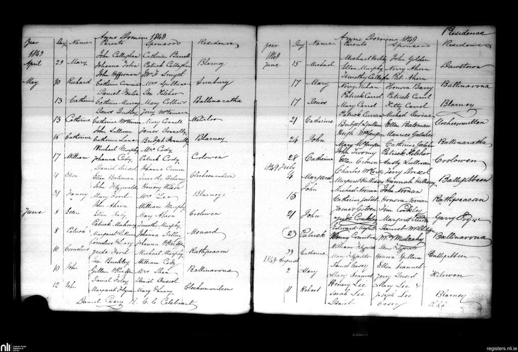 Blarney; County of Cork; Diocese of Cloyne. Baptisms, Apr. 1849 to Aug. 1849