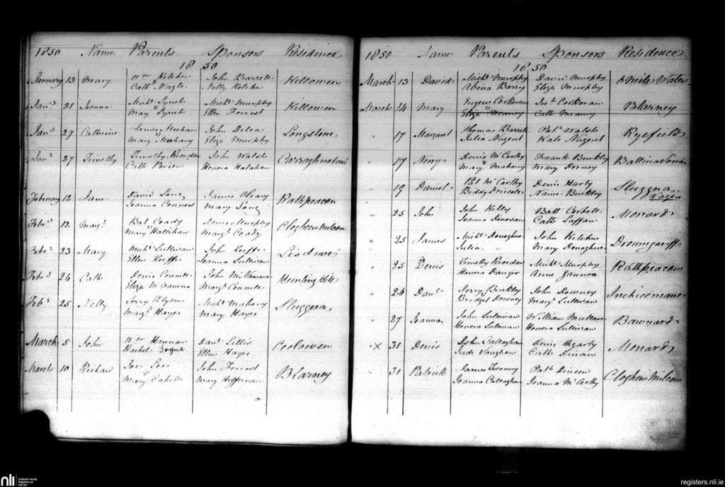 Blarney; County of Cork; Diocese of Cloyne. Baptisms, Jan. 1850 to Mar. 1850