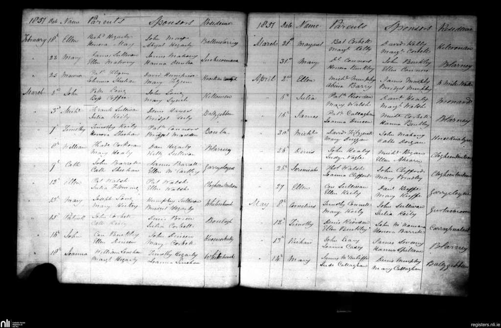 Blarney; County of Cork; Diocese of Cloyne. Baptisms, Feb. 1851 to May 1851