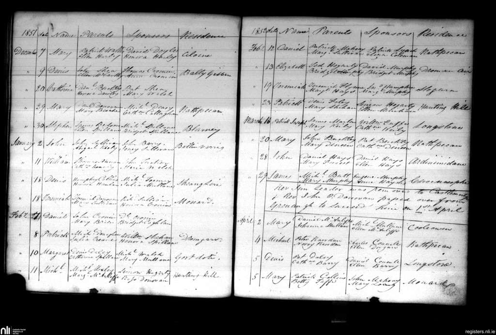 Blarney; County of Cork; Diocese of Cloyne. Baptisms, Dec. 1851 to Apr. 1852