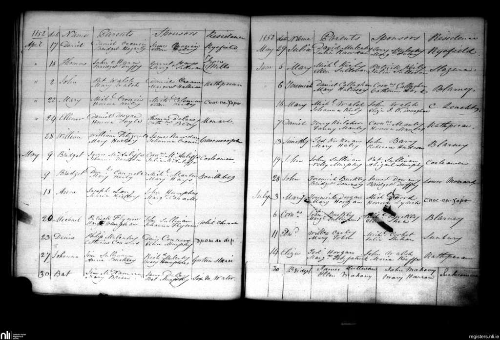 Blarney; County of Cork; Diocese of Cloyne. Baptisms, Apr. 1852 to July 1852