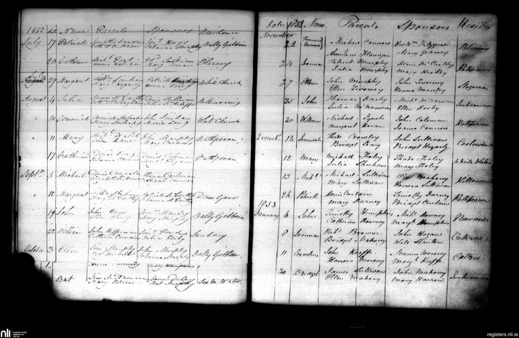Blarney; County of Cork; Diocese of Cloyne. Baptisms, July 1852 to Jan. 1853
