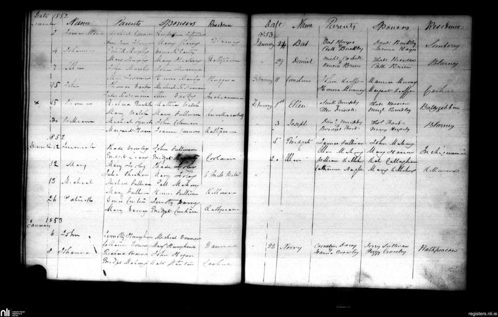 Blarney; County of Cork; Diocese of Cloyne. Baptisms, Nov. 1852 to Feb. 1853