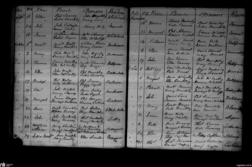 Blarney; County of Cork; Diocese of Cloyne. Baptisms, Sep. 1854 to Dec. 1854