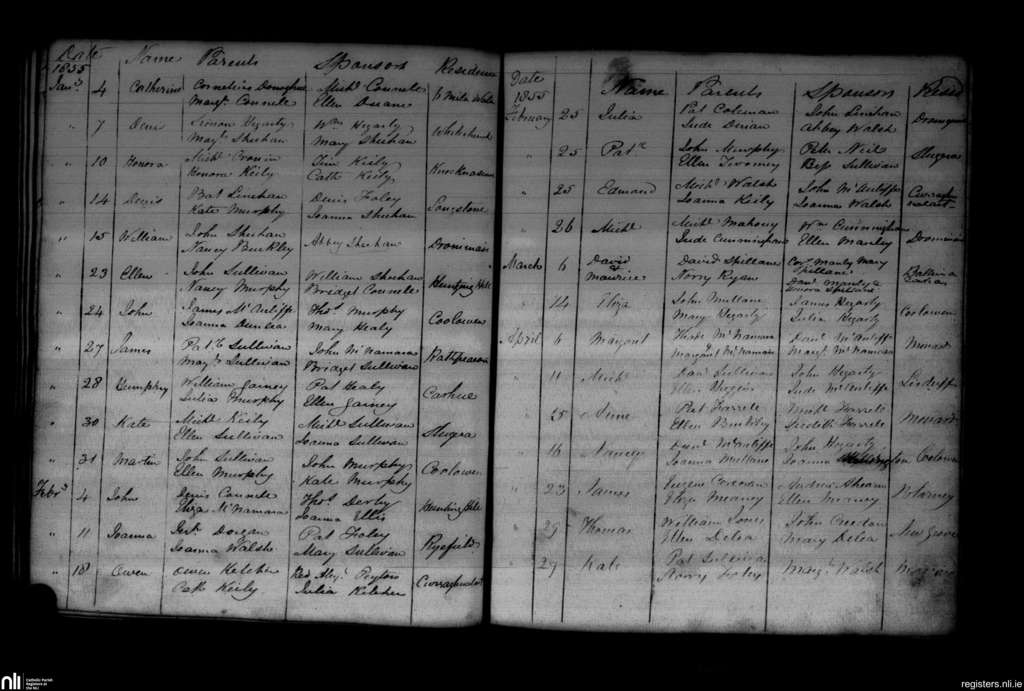 Blarney; County of Cork; Diocese of Cloyne. Baptisms, Jan. 1855 to Apr. 1855