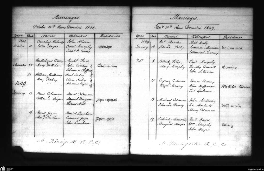 Blarney; County of Cork; Diocese of Cloyne. Marriages, Oct. 1848 to Feb. 1849